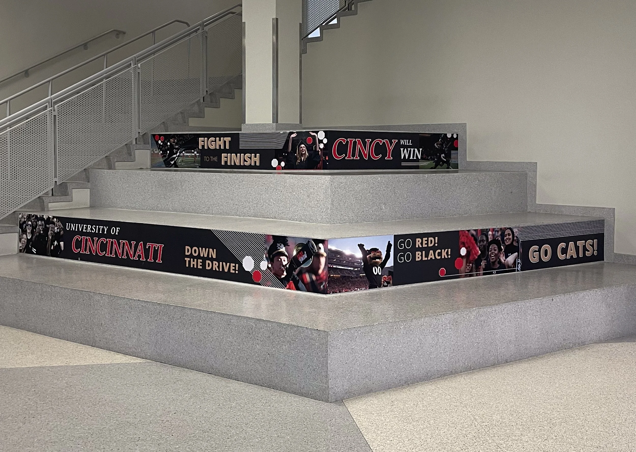 Located at the center of UC’s main campus, the Tangeman University Center (TUC) has served students since 1937, providing a space for them to convene, eat or study. This graphic installation intend to evoke school spirit and create excitement for UC in a frequently used common space for students. Fueled by the desire to elevate spirit, I reimagined this empty space using bold images, spirited graphics and energizing fight song phrases.